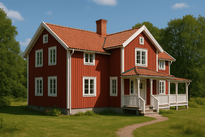 - Charakteristische Optik: Vertikale oder horizontale Holzverschalungen, oft in Falunrot, Grau, Weiß oder Naturtönen; Sprossenfenster, Veranden, Gauben.